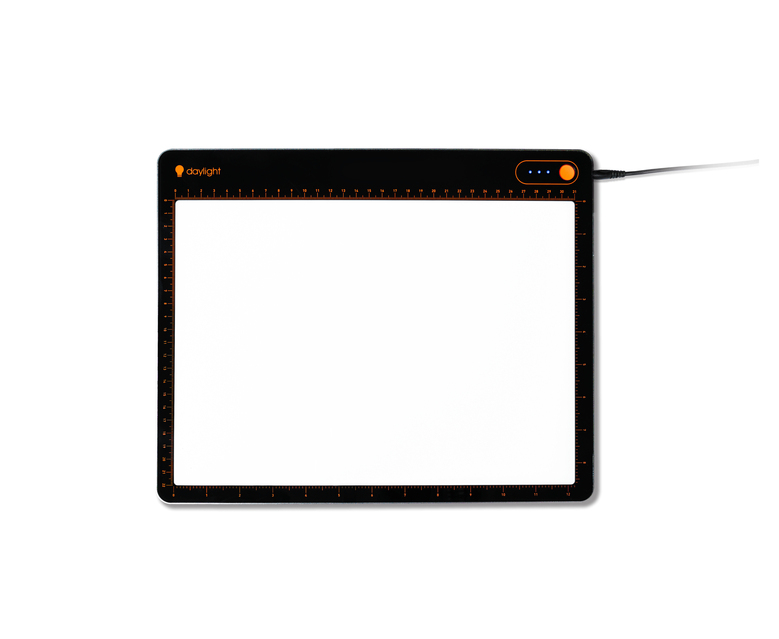 De Daylight Tabla Go is een premium lightpad, speciaal ontworpen met kunstenaars in gedachten. De Tabla Go lightpad is een onmisbaar hulpmiddel bij het overtrekken op papier of stof. Deze ultraplatte LED-lightpad, van slechts 8 mm dik, beschikt over ultraheldere LED-verlichting (6000 kelvin) voor echte kleurnauwkeurigheid en gelijkmatige helderheid van rand tot rand. U kunt het licht in 3 stappen dimmen zodat het geschikt is voor zowel papiergewicht als stofdikte. De leds produceren vrijwel geen warmte en hebben een laag energieverbruik. De dimmer heeft een geheugenfunctie, waardoor de lightpad weer inschakelt in de instellingen waarin u hem heeft uitgeschakeld. Aan de zijkanten bevindt zich een handige markeringsgeleider (in inch en centimeter).