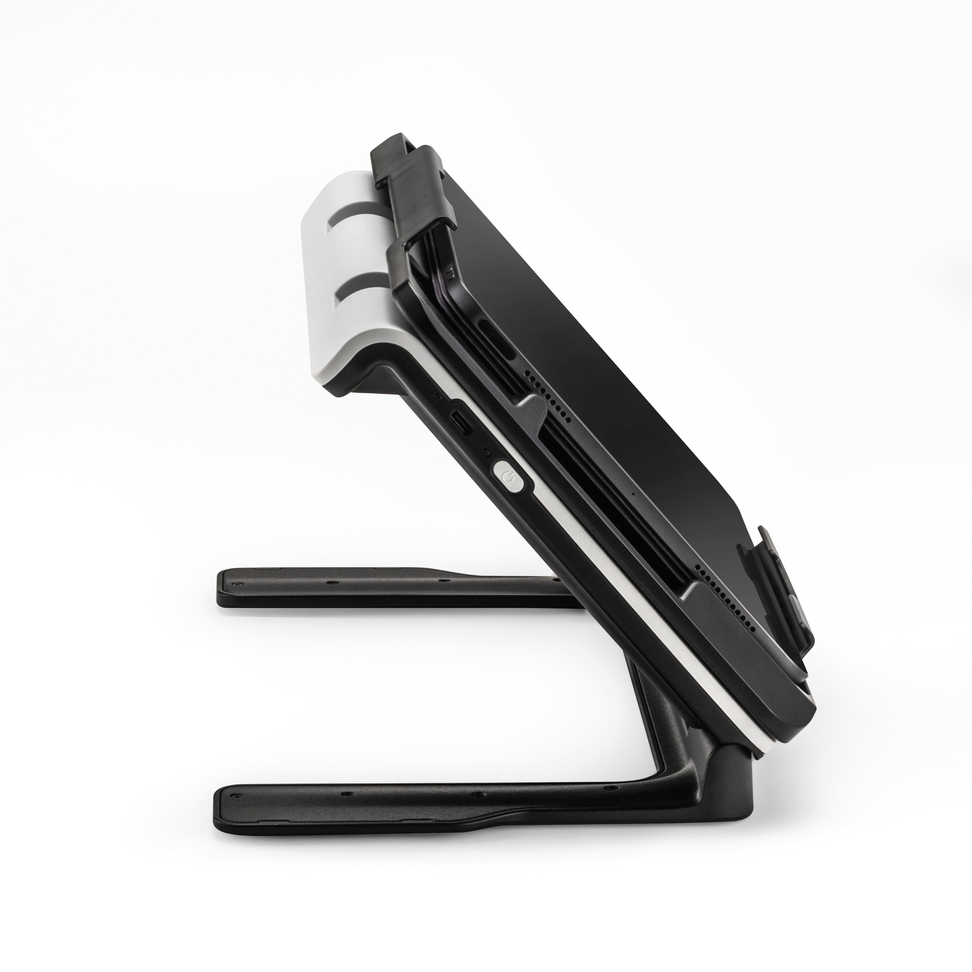Om de Optaro XL te gebruiken, plaatst u de iPad in de standaard en sluit u de Optaro® XL aan met de USB-C-kabel (meegeleverd). Eenmaal aangesloten, biedt de Optaro® XL-cameramodule een vergroting van 2,5x – 22x en een groot gezichtsveld dat zichtbaar is op het iPad-scherm. Er zijn twee weergaveposities beschikbaar, waaronder een voor snel lezen en dagelijks gebruik, en een andere die meer zichtbaarheid biedt voor het lezen van langere teksten, schrijven en knutselen.