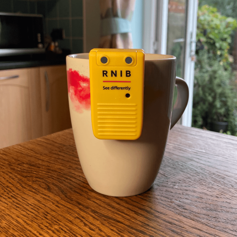 De gele en groene vloeistofindicator is een variant met geluid en trilling, die ook voelbare signalen afgeeft. Dit laatste is met name een uitkomst voor doof(blinde) mensen. De vloeistofniveau-indicator kan namelijk twee verschillende niveaus meten: Als een glas gevuld wordt, geeft de indicator een onderbroken akoestisch signaal en een onderbroken trilsignaal, ten teken dat het glas bijna vol is. Als u verder schenkt en het glas is helemaal vol, dan voelt u een doorlopend trilsignaal en u hoort een snelle reeks pieptonen.